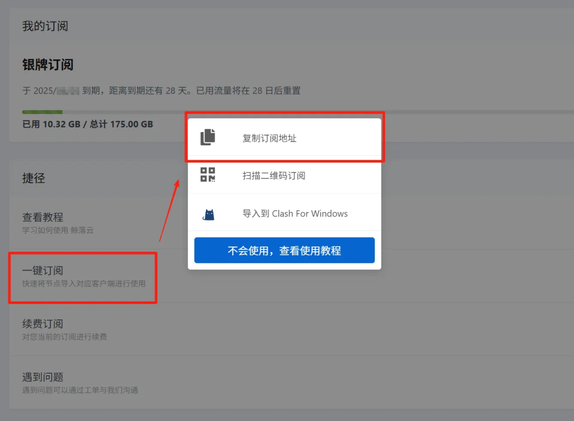 登录官网后,首页点击“一键订阅”-“复制订阅链接”,您就得到了账号对应的订阅链接。