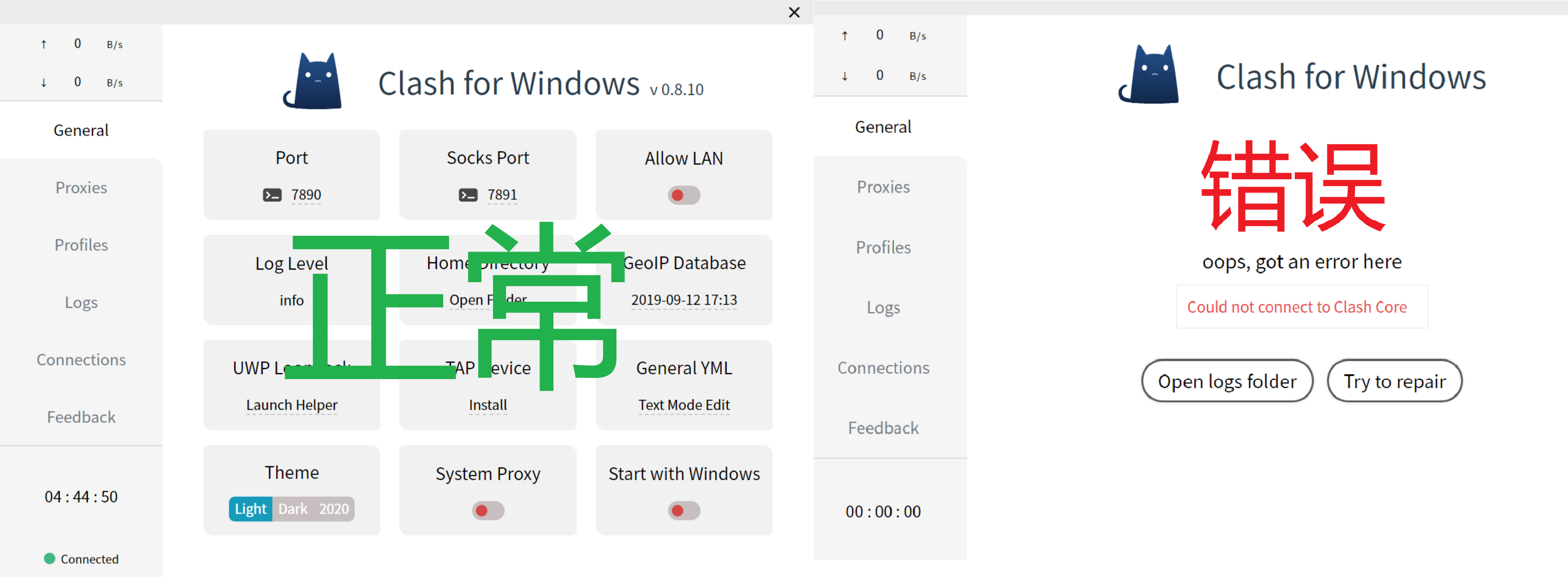 1.点击「Try to repair」,弹出的对话框选择「yes」,然后在系统托盘中(屏幕右下角的小图标)退出clash。重新打开 clash 查看是否正常