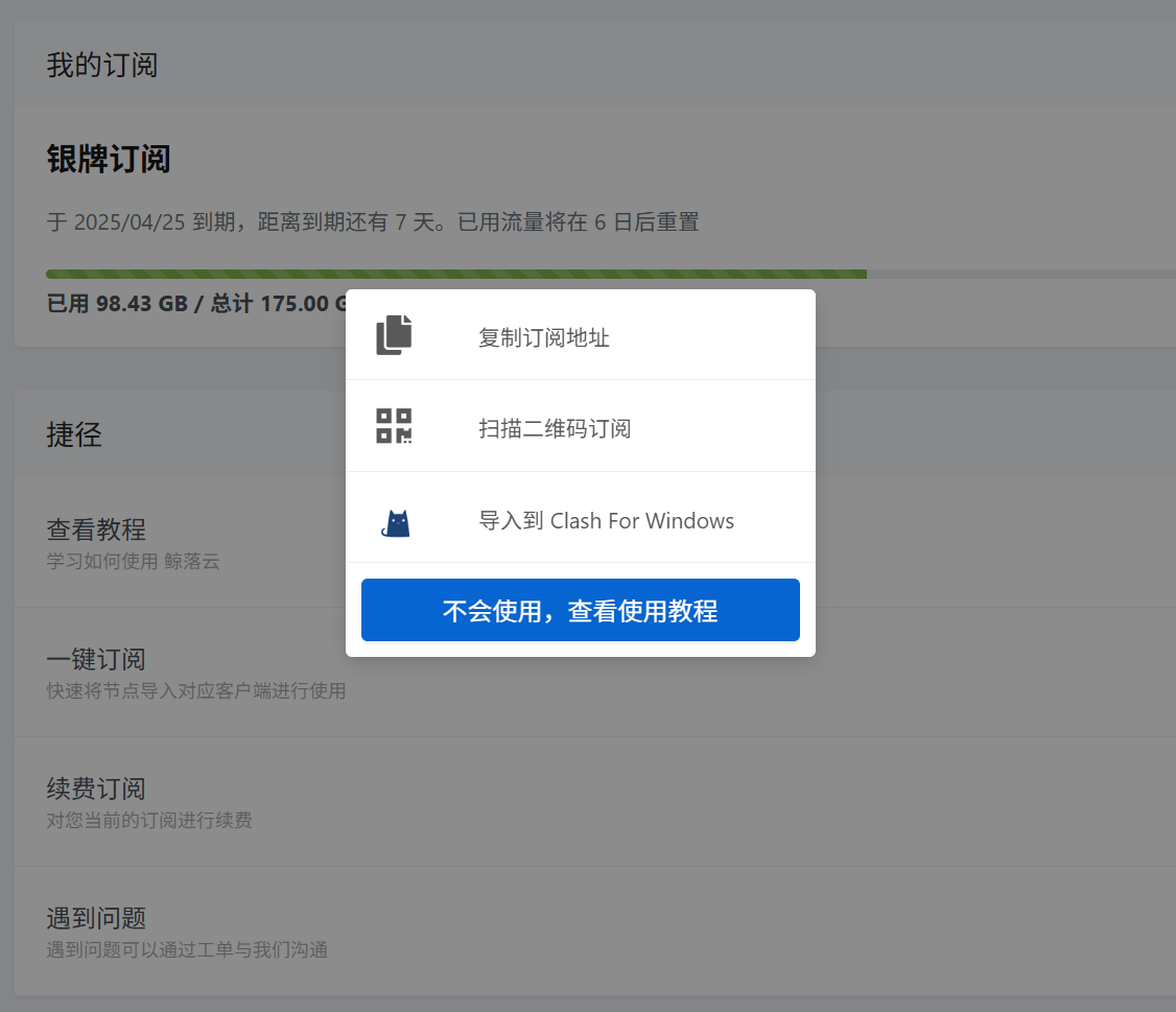 鲸落云是节点提供商,本教程选用的 Clash for Windows 是第三方开发的客户端,和鲸落云没有利益关系。如有程序bug,请向开发者反馈,鲸落云无法解决客户端层面问题。