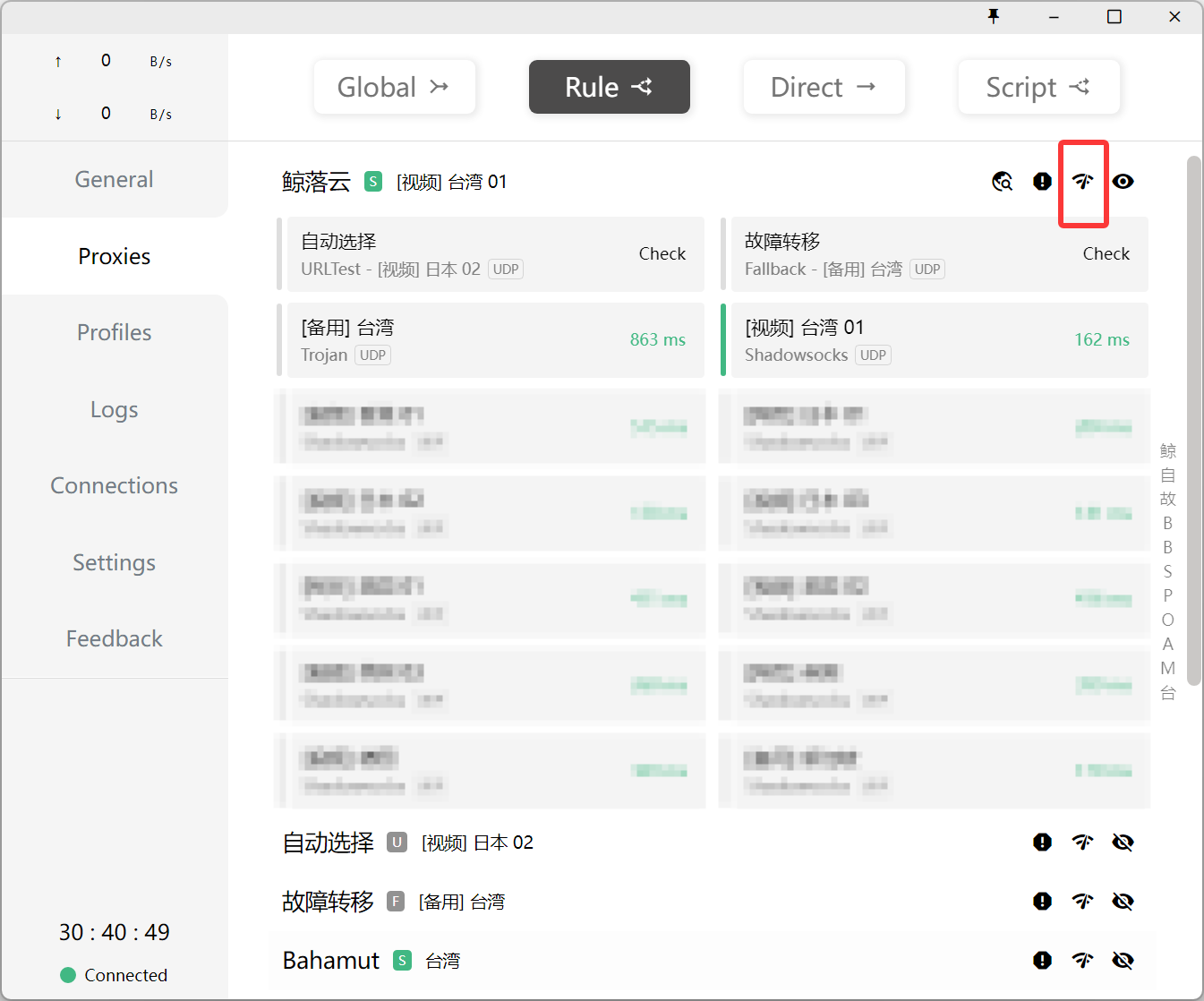 图中红框内,类似仪表盘的图标,是“节点测试”功能。点击后,节点右边会出现绿色的数字。有数字的,表示节点正常工作。如果显示为红色的”timeout”,表示节点不通,请不要选择。选择不通的节点,会导致访问部分网站出现问题。