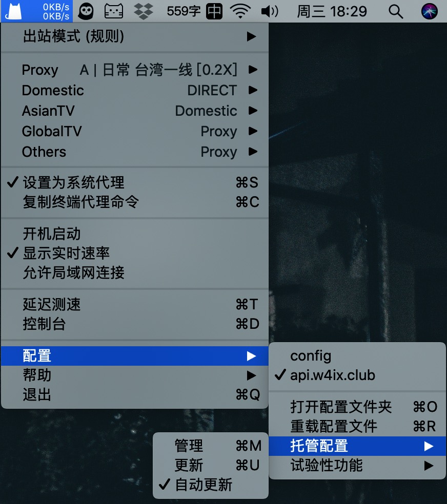 确保按下图所示勾选自动更新,这样会在每次启动 ClashX 时自动更新节点