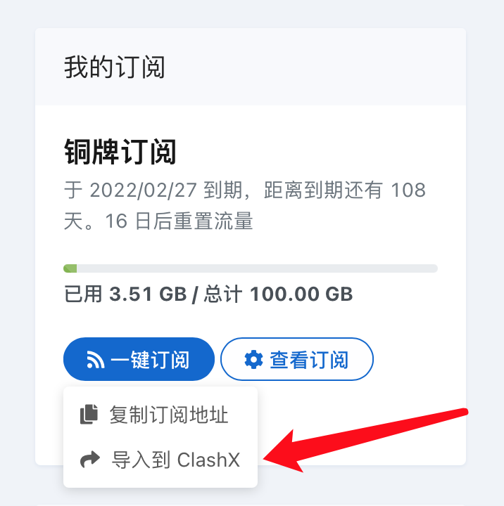 登录网站,点击「一键订阅」按钮,再点击「导入到ClashX」
